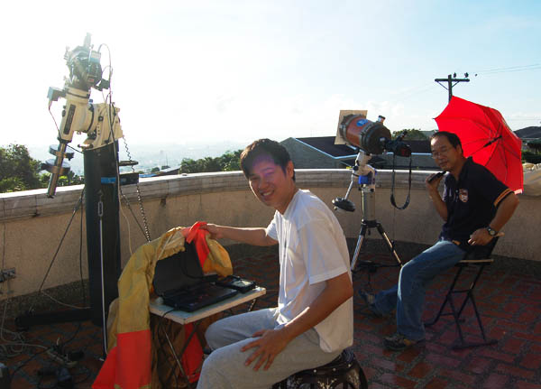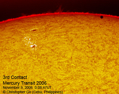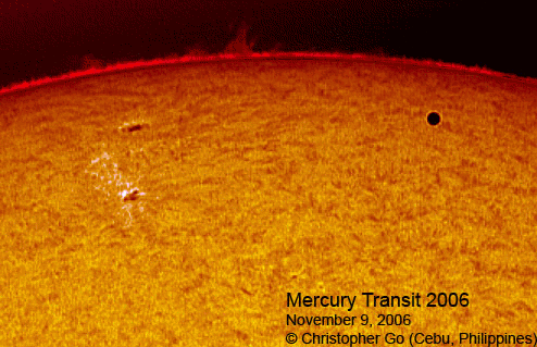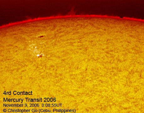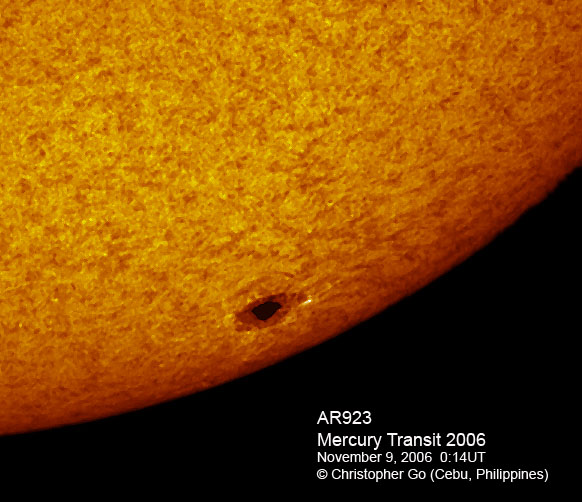 was i![]() I am using a Solarmax 60 Hydrogen Alpha Filter attached to my Astrophysics AP130EDF refractor. For imaging I used trusty DMK 21BF04 camera. Tomio used his C8 with Baader Planetarium Astrosolar density 5 filter and his Canon Digital Rebel XL camera. Seeing was around 9/10 with 4/5 transparency. Mercury was already past maximum transit during sunrise. Sadly I wasn't able to capture because of low clouds. I was able to get a good record on the last 10 minutes of the transit. As a bonus, sunspots AR921 and 922 are in the field of view of Mercury. Including some small fireworks from AR922! Also another surprise was AR923 rising which is a huge sunspot. After the Transit, Tomio and I were very exhausted because of the heat but we were very happy! This will be the last Mercury transit visible in the Philippines till 2032. But this is the 4th Mercury transit I have observed and Tomio's first! |