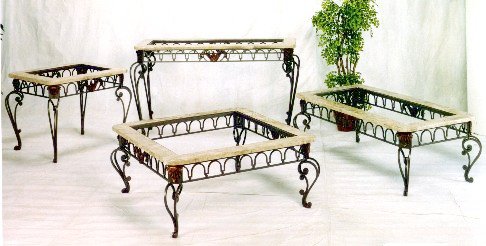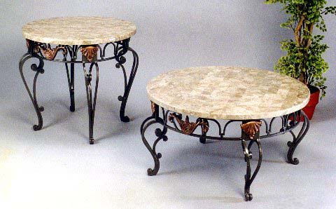 HAND FORGED KNOCKDOWN WROUGHT IRON TABLE WITH FOSSIL STONE TOP AND GLASS INSET WITH ANTIQUE COPPER MEDALLIONS