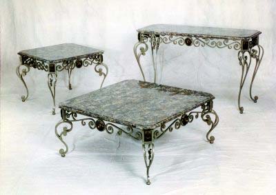 HAND FORGED KNOCKDOWN WROUGHT IRON TABLE WITH FOSSIL STONE TOP AND MEDALLIONS