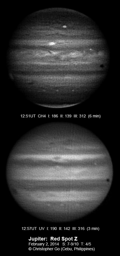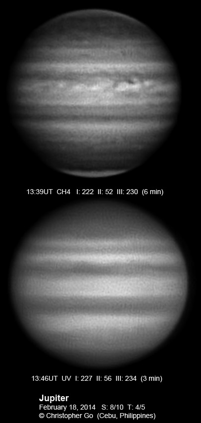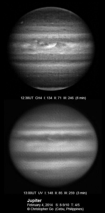 February 19, 2014 Looking at the images tonight, one might think that I had perfect conditions. However, conditions were far from perfect. Transparency was very poor because of thin clouds despite the excellent seeing conditions! I could only use less than half my usual the frame rate with full gain! This is derotation to the rescue! I just double my usual RGB sequence I take and derotated all these images! Individually, each image is very grainy but after derotation, I got these excellent images! The Red Spot Z can be seen close to the CM. The new red spot still has a faint red color. The NNTZ LRS can be seen in the north. The GRS is rising on the left. Note the light feature on the SEB seem to be approaching the GRS! I wonder what this feature is.... There are some activity on the NTBn. Unfortunately, I couldn't do any CH4 or UV images because of poor transparency. I'm leaving for Manila tomorrow to give two workshops on Planetary imaging. Hope to be back imaging on Saturday. THE SECOND ROUND: After processing my first set of images, I went out and saw Jupiter out of the clouds! I couldn't resist going on a second round with the GRS at the CM. Transparency was a little better that earlier but it still wasn't great while seeing was excellent! The GRS is at the CM! Note the white spot at the 2 o clock position of the GRS! The GRS is well resolved. Note the dark core and some hint of the vortex arms. The wake of the GRS is complex with some outbreaks close by. The STrZ has a yellowish tinge. The STrZ around the GRS also looks a bit disturbed. The NEB is dark and narrow. Some outbreaks can be seen. Note the bright spots congregating on the NTB! Is this outbreak similar to the powerful outbreak in 2007?