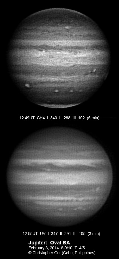 February 1, 2014 We had a powerful tropical storm this morning. Fortunately, no serious damage here in Cebu. The tropical storm seemed to have wiped away all our bad seeing here. Seeing was incredible this evening. Unfortunately, I had to deal with dew which was a bit frustrating at times! The Red Oval BA is prominent in these images. Note the dark thick ring around Oval BA and it's complex wake. Note also the dark line of dark materials that is coming from the GRS going to Oval BA. The SEB shows the wake of the GRS. There are some outbreaks in the NEB. The NEB is still dark red. The NTB looks quiet. White spots can be seen up to both polar regions including the reddish spot on the SPR.