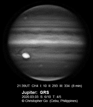 2020 Seeing was good today. I finally have some decent images of Jupiter! The GRS is prominent on these images. Seeing was so good that details inside the GRS are well resolved! As Niall has mentioned in his observations, the chimney above the GRS is open! The GRS halo and chimney are bright in methane band! The wake of the GRS is very turbulent and bright outbreaks can be seen developing! Note the reddish streak on the STrZ on the immediate SW of the GRS. The southern NEB is very dark red. The northern part of the NEB is seem to be fading. The NNTZ LRS is prominent. A hint of the red ring can be seen.