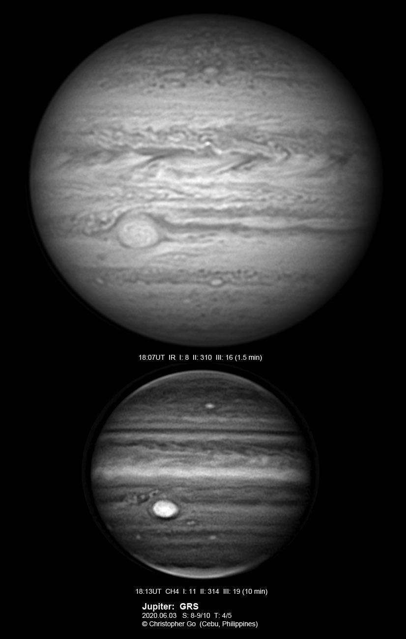 2020 I overslept today and did not wake up till 5am. I rushed to image Jupiter and fortunately the seeing was excellent. For the methane band though, the GRS was over exposed because I captured it a few minutes before sunrise. The GRS is well resolved in these images. Note the extension on the f side of the GRS. Is flaking still happening? There are bright outbreaks on the wake of the GRS. Note the bluish streak on the NTB on the lower left of the GRS. The NEB is dark and narrow in this region with a lot of rifting.