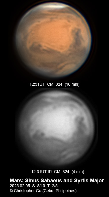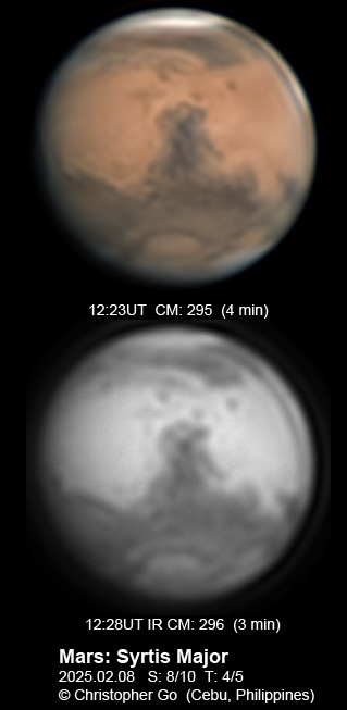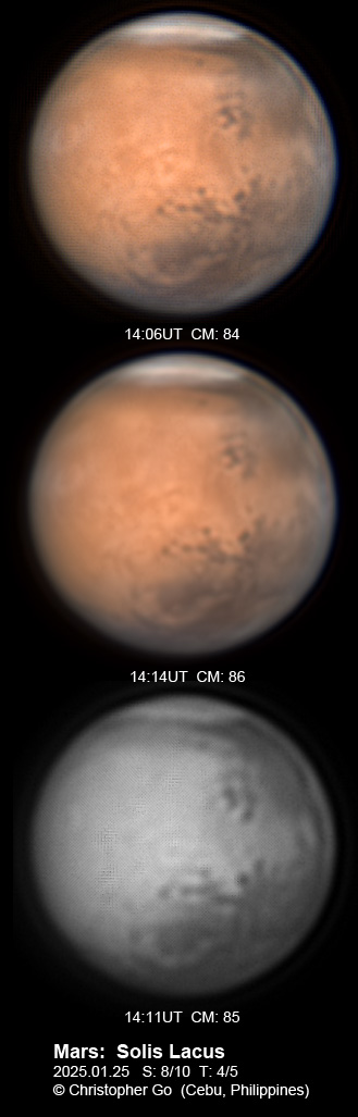 February 8, 2025 Seeing was variable today. These images show Syrtis Major at the CM. Hellas looks cloudless below Syrtis Major. Sinus Sabaeus is on the left. |