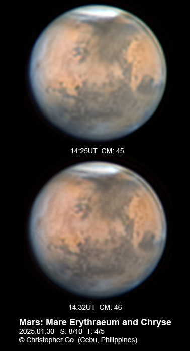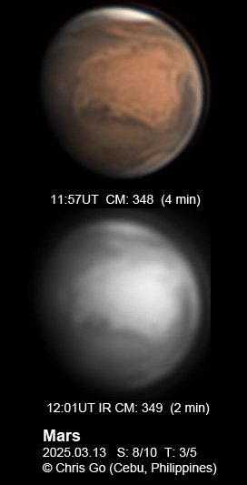 March 13, 2025 Conditions were very good today. But Mars is getting smaller! These images show Sinus Sabaeus and Sinus Meridiani. Hellas can be seen on the lower right and there seems to be some clouds over it. Syrtis Major is setting on the right.