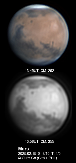 February 15, 2025 After a week of cloudy and rainy weather I finally had a break to image Mars. Seeing was excellent Syrtis Major can be seen on the left while Mary Cimmerium is on the lower right with Sinus Gomer sticking out. Elysium is on the upper right. The albedo feature on Elysium is gone.