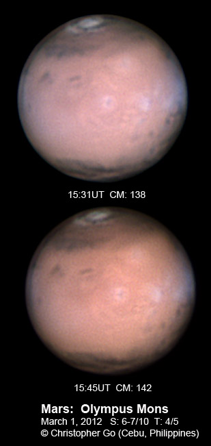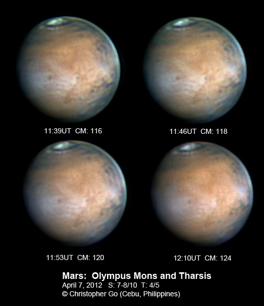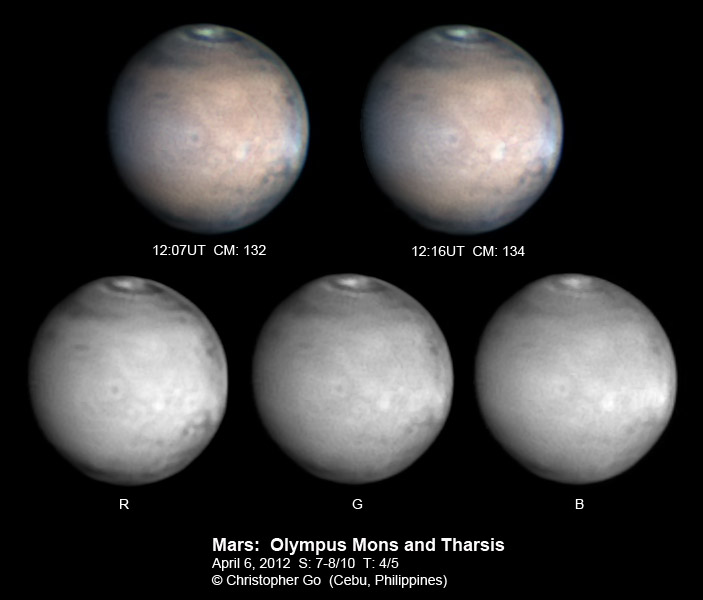 April 6, 2012 Finally had excellent seeing this evening. I used a Baader UV/IR blocking filter for these images. Olympus Mons is close to the CM at the center of Mars. It is the distinct dark spot on the center of Mars. The Tharsis Volcanoes can also be seen with their clouds. The north polar cap is getting smaller.