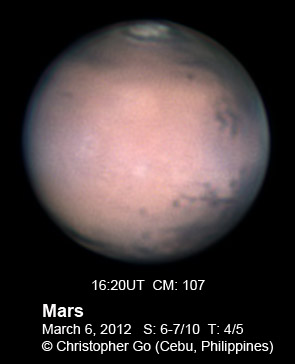 March 6, 2012 Seeing was a bit unstable today. There were clouds in the sky. Mars is less cloudy today. Olympus Mons can be seen on the center left. The Tharsis Volcanic Region is at the CM. Not a lot of clouds on top of the volcanoes here. Solis Lacus is setting on the lower right. The Northern Polar Cap is shrinking.