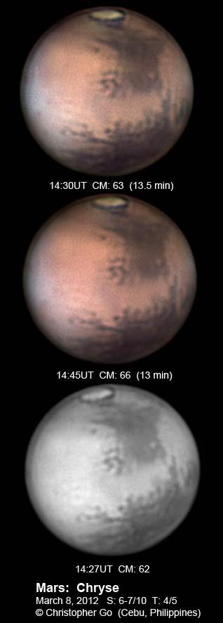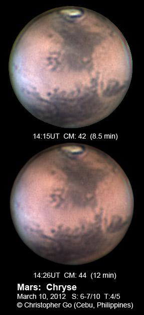 March 13, 2012 I spent about an hour re-collimating my OTA this evening. Seeing was still unstable but the recollimated scope gave a more pleasant image. Mare Erythraeum and Chryse are rising on these images. Sinus Meridiani is at the CM. The north polar cap is getting smaller.
