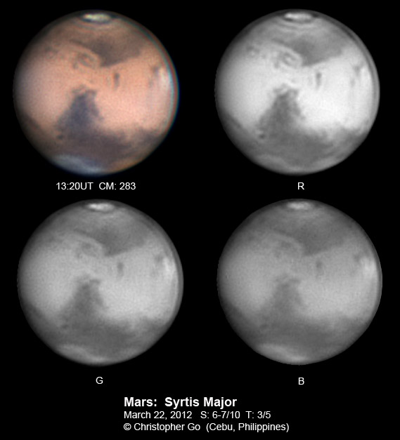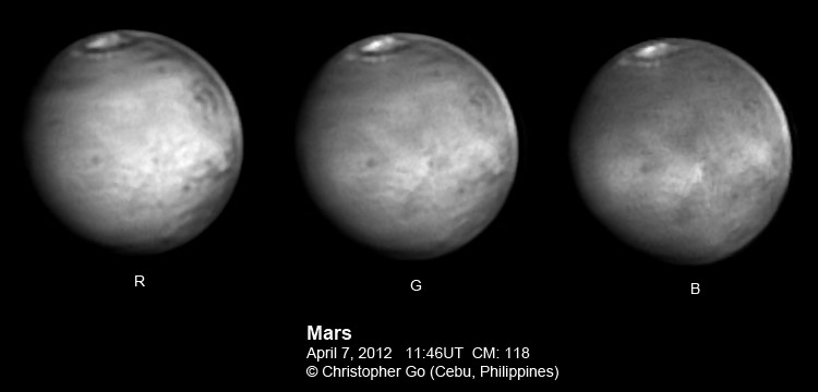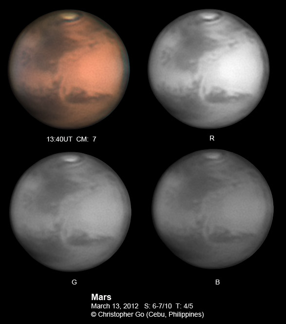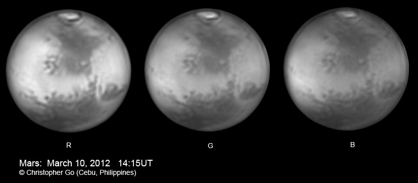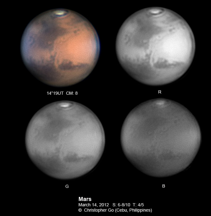 March 14, 2012 Thanks to Christophe Pellier and Damian Peach for pointing out the IR leakage of my B channel. I got my Astrophysics Dielectric diagonal as my trusty UV-IR blocking filter. Seeing was good this evening. My images today is very similar to the image I took yesterday. Because of better seeing, more details can be seen and features are clearer. Clouds can be seen on both the eastern and western edges of Mars. The north polar cap is still a bit yellowish. Note the dark ring around the polar cap.