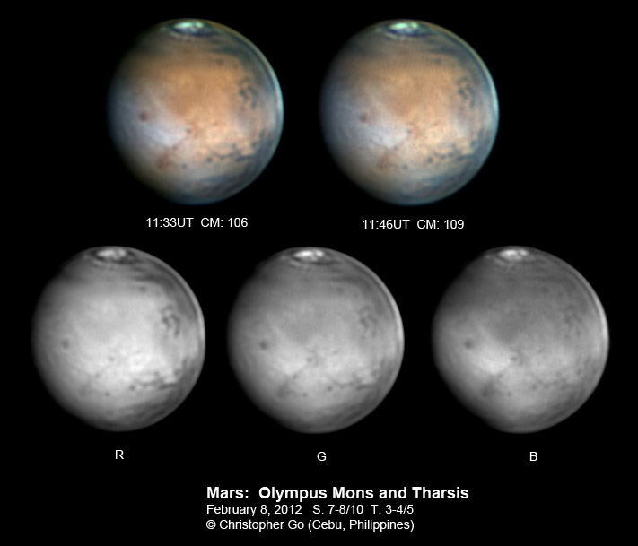 April 8, 2012 Happy Easter everyone! Seeing was okay this evening. I used Winjupos Derotation on these images. Olympus Mons is the dark spot surround by the morning clouds. There are clouds around Daedalia. The Tharsis Volcanic peaks: Arsia, Pavonis, Ascraeus Mons are prominent in these images.. The North Polar cap continues to shrink. There is a bright ice layer outside the dark ring that surrounds the polar cap.