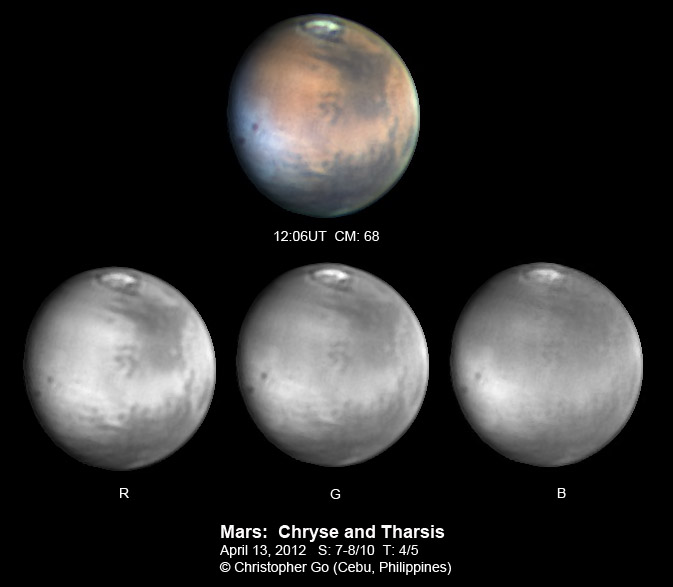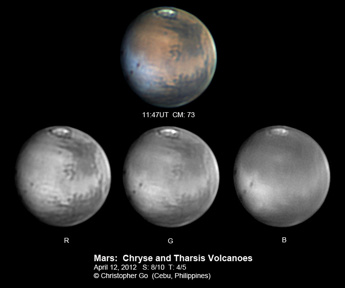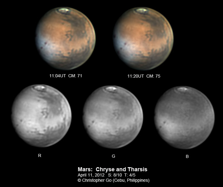April 12, 2012 Seeing was excellent this evening. I imaged Mars when it was over 80 deg in altitude. This may be the reason why there is less artifact on these images. The Tharsis Volcanoes are very prominent on the left with the peaks sticking above the cloud top. Olympus Mons is rising. The north polar cap continues to recede. There are many details resolved on Chryse, Mare Erythraeum, Niliacus Lacus, and Mare Acidalium.