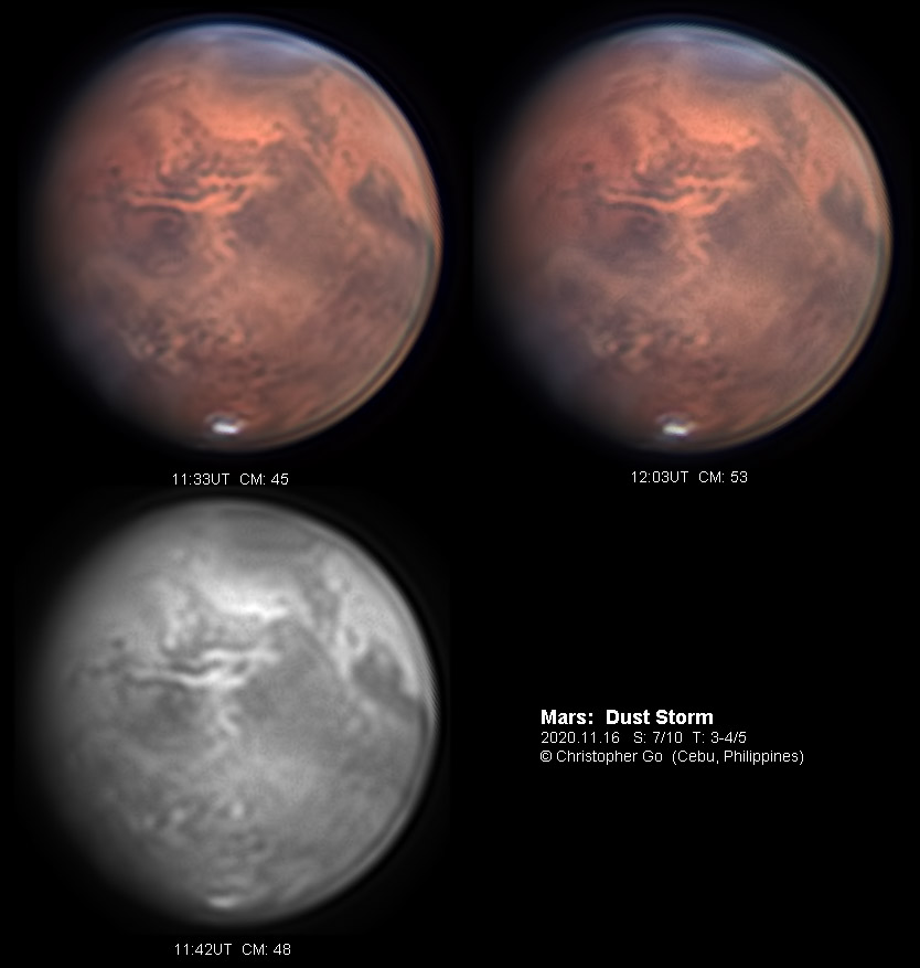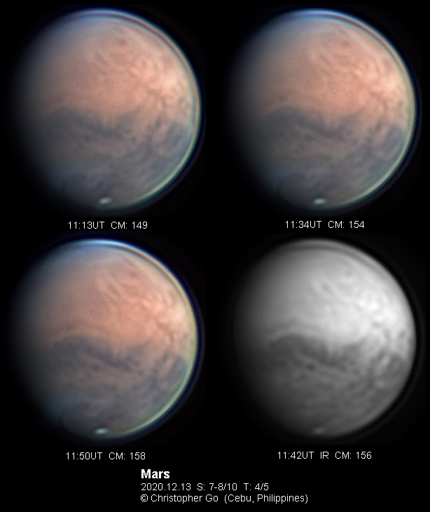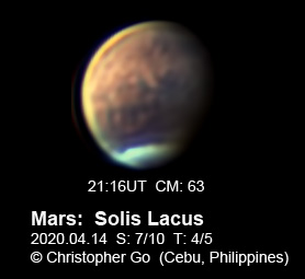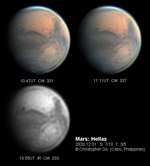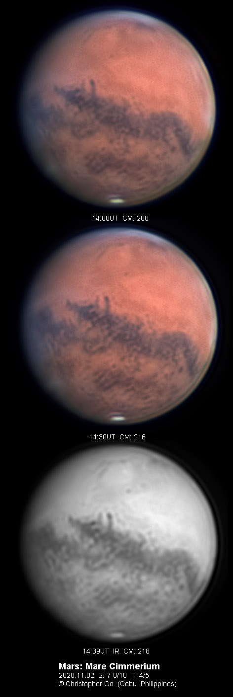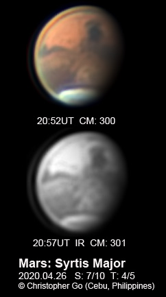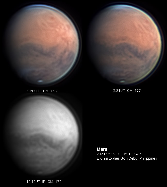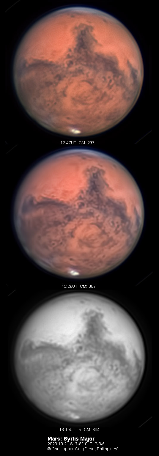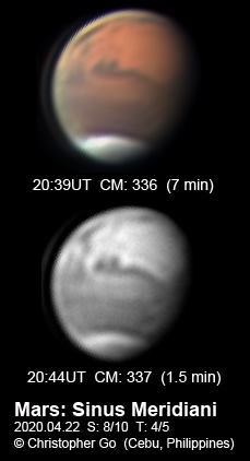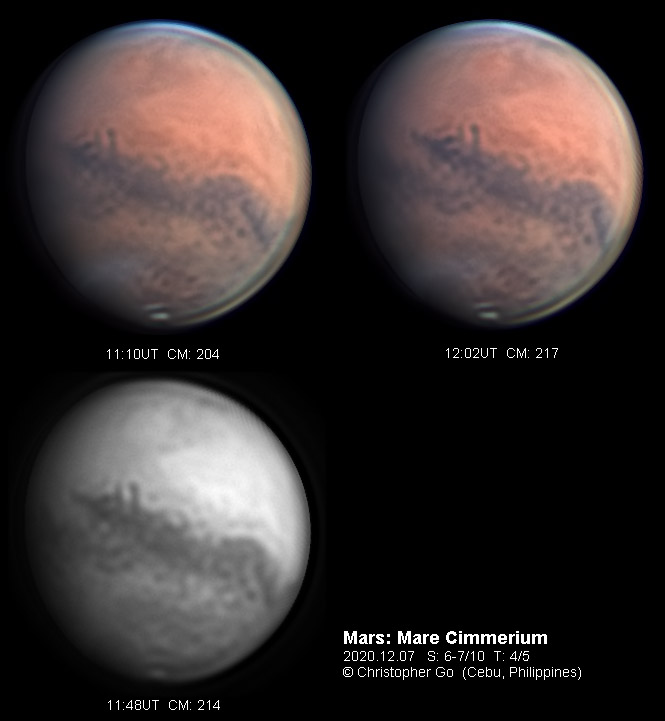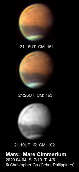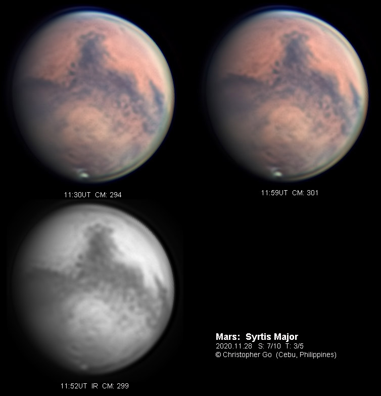 These images are similar to the one I took yesterday. Syrtis Major is prominent. The Huygens crater can clearly be seen. There are morning clouds at SInus Meridiani. The shape of the north polar hood is different from that you yesterday.