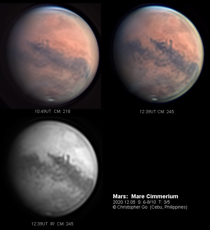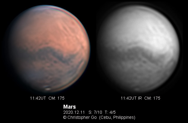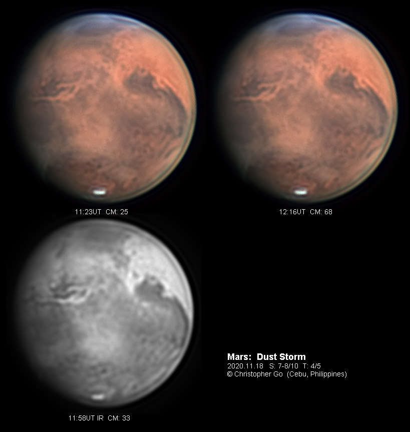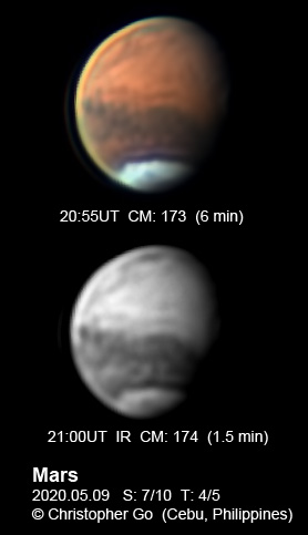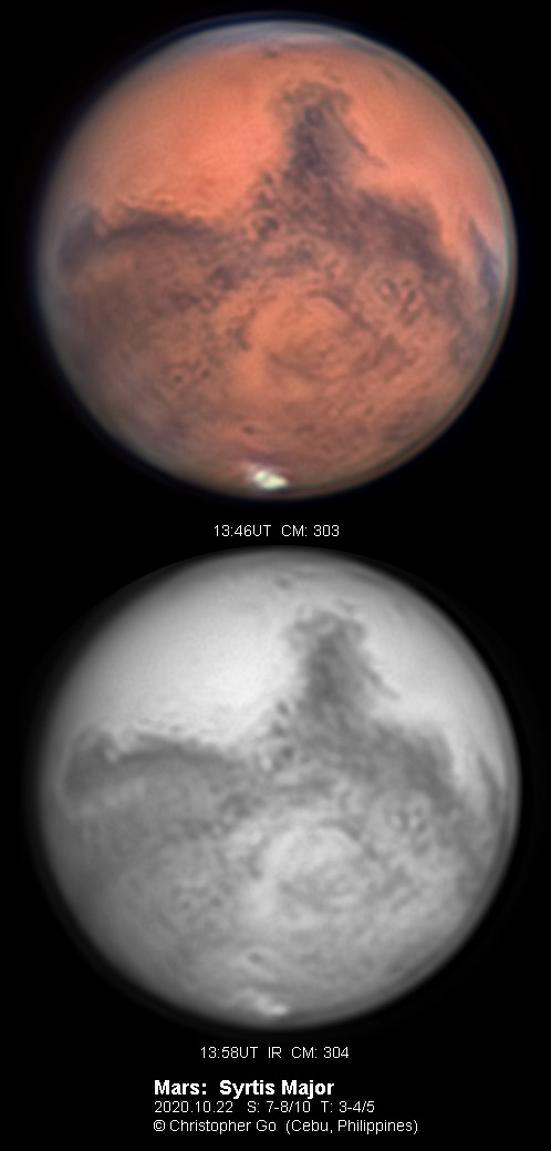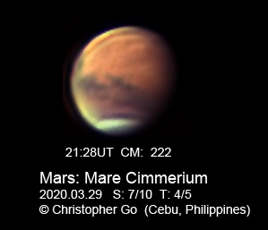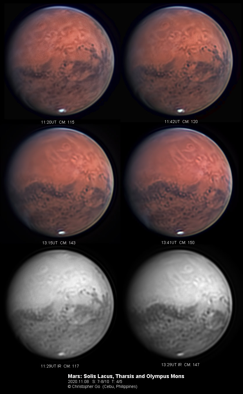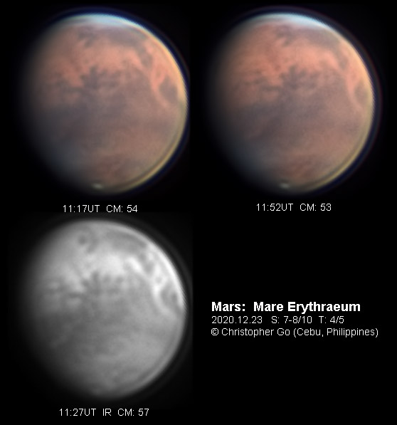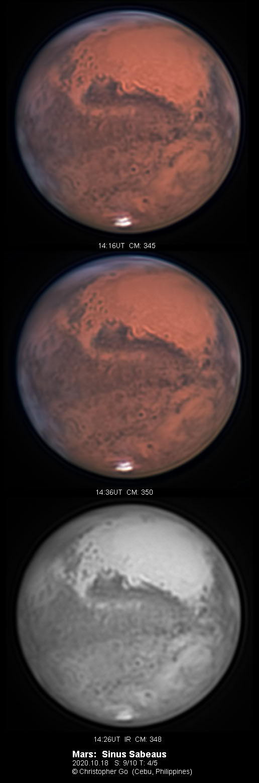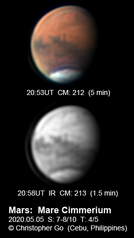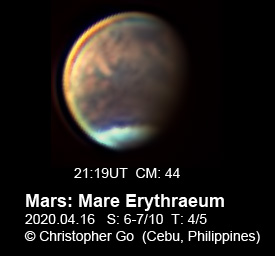 These images are similar to the one I took yesterday. Syrtis Major is prominent. The Huygens crater can clearly be seen. There are morning clouds at SInus Meridiani. The shape of the north polar hood is different from that you yesterday.