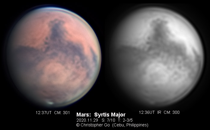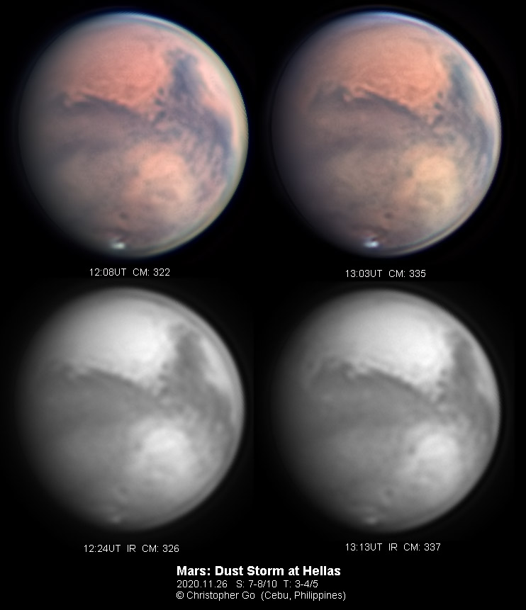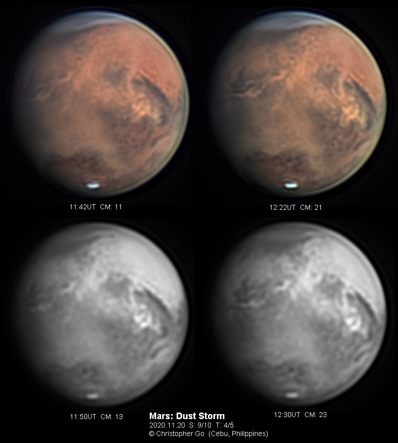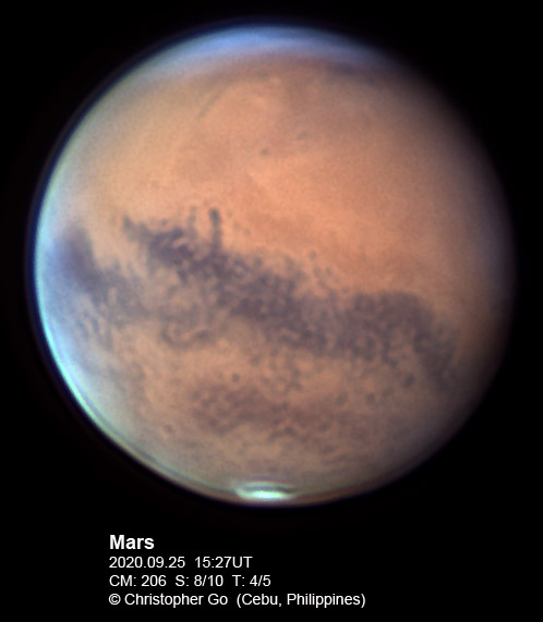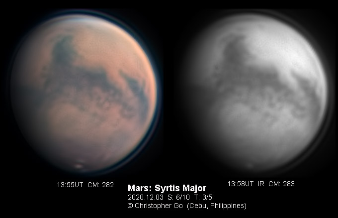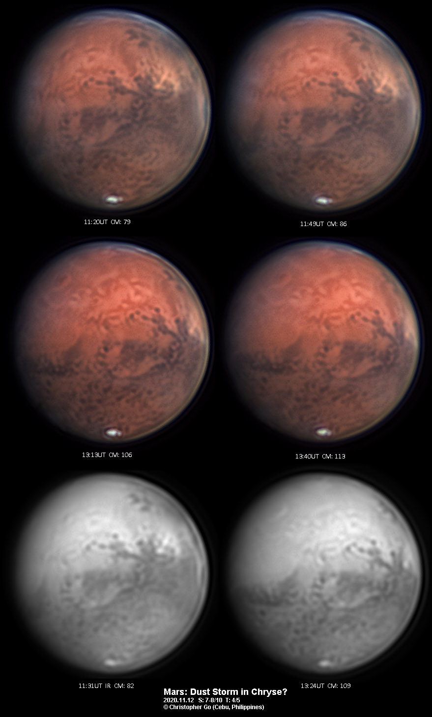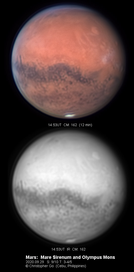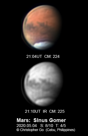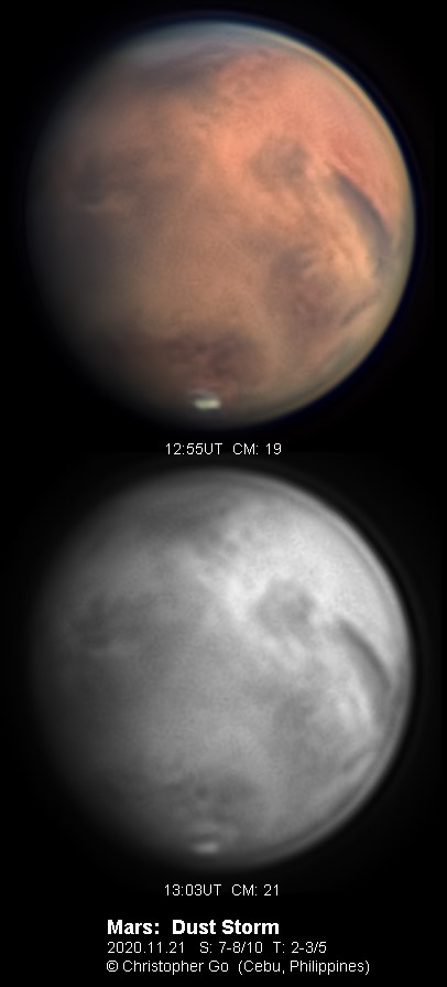 These images are similar to the one I took yesterday. Syrtis Major is prominent. The Huygens crater can clearly be seen. There are morning clouds at SInus Meridiani. The shape of the north polar hood is different from that you yesterday.
