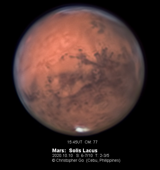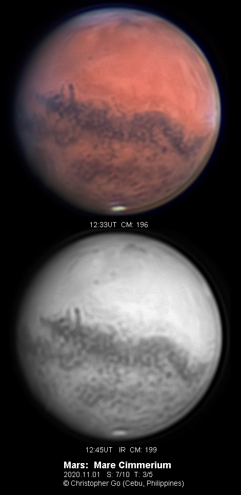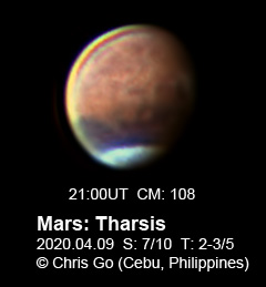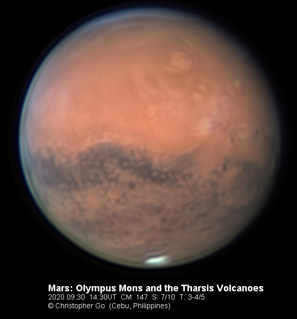Seeing was good today. Mare Cimmerium can be seen. Elysium can be seen on the upper left while there is a hint of Olympus Mons on the upper right.