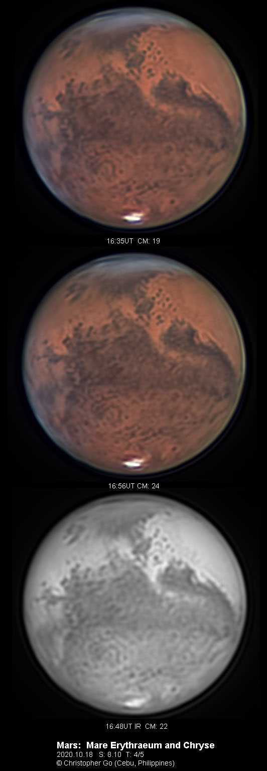 Sinus Sabeaus and Sinus Meridiani is the highlight of this region. Syrtis Major can be seen setting on the right while the Chryse region is rising on the left. After I finished processing my first run, I went out to check the sky and it was clear! Because of the weather here, I missed imaging the region of Mare Erythraeum and Chryse so I went ahead and started another run. Seeing was only 8/10 so not as good as the seeing earlier. But a lot of details are resolved and I'm happy with the result.