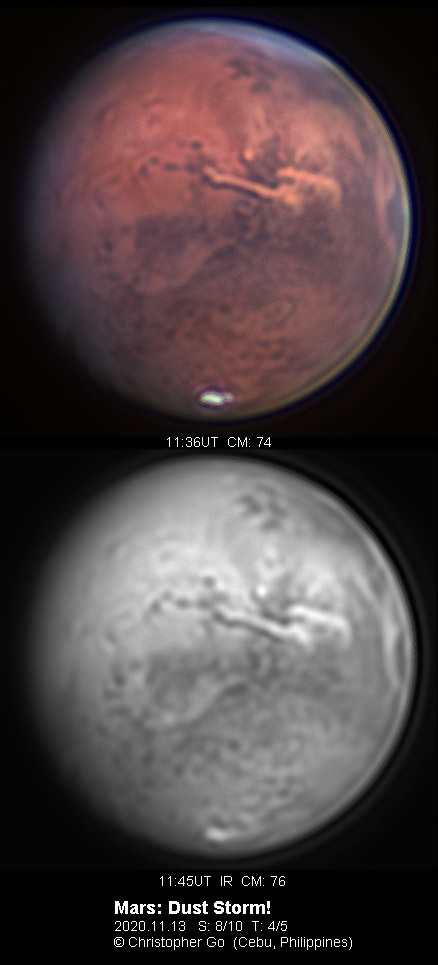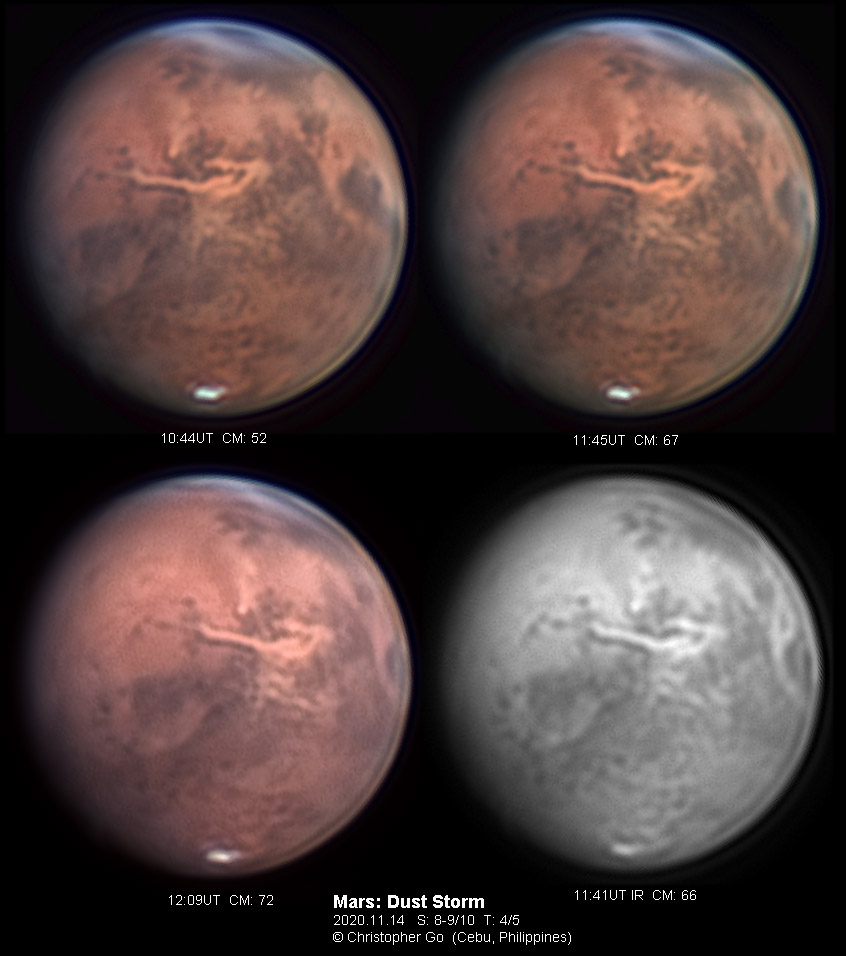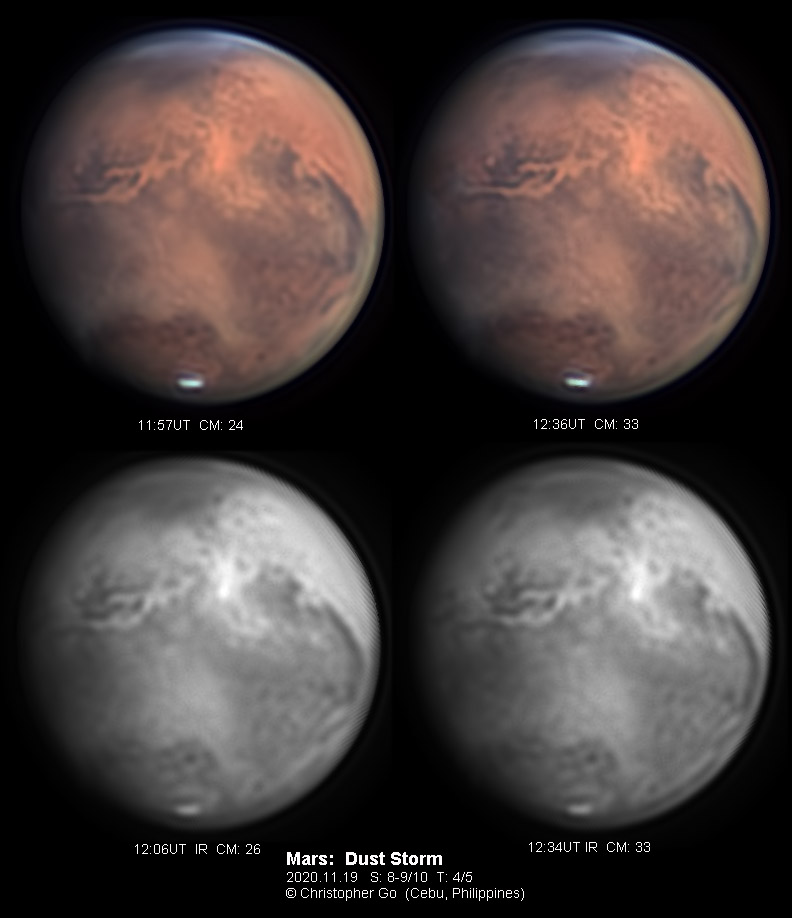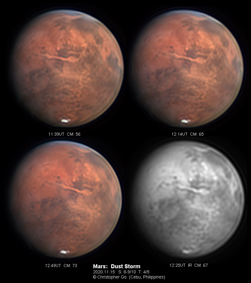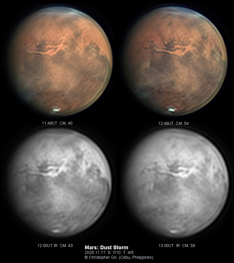 The Dust storm continues. It is now spilling over the Ganges! Valles Marineris is prominent due to the dust storm. Some dust are spreading to Mare Erythraeum. It is amazing to see how much it moves overnight!
