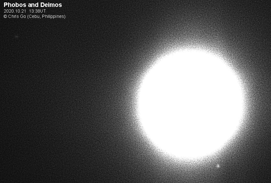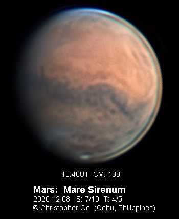 These images shows Syrtis Major. The rim of Huygens crater is distinct. The Hellas basin is clear this season. Sinus Sabeaus can be seen on the left. I was also able to capture Phobos and Deimos which helped in derotating the images I took.