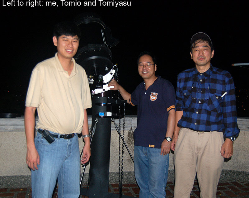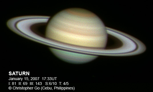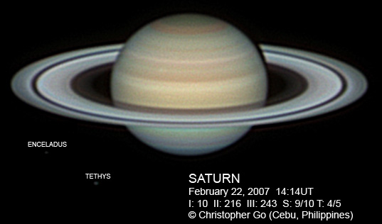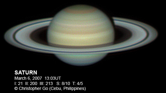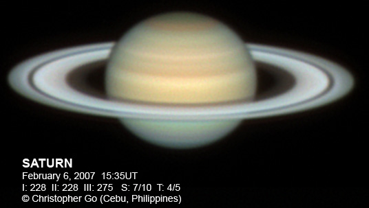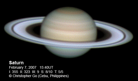 February 10, 2007 Here's an image of Saturn during Opposition day! I was imaging with my buddy Tomio Akutsu and a friend from Japan Tomiyasu (see below). Tomiyasu came over to Cebu from Japan just to see the Saturn Opposition here!! The Seeliger Effect or Opposition Effect is at it's peak The ring is very bright! The disk itself is very pale and there seems to be no spots visible in either the SEB or the STB. Saturn was at the Zenith (about 85 deg at local midnight) when I took this image. Note the NNTZ white line at the northern edge of Saturn.