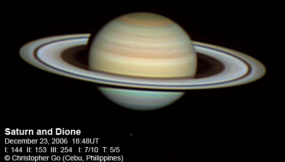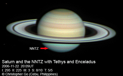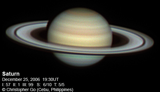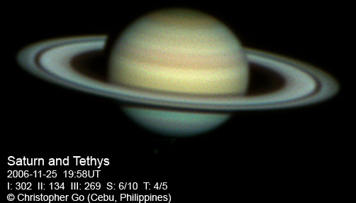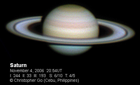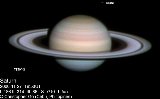 November 27, 2006 Seeing was not great this morning at around 7/10 because of an incoming Typhoon Durian. Sadly this system is expected to become a Super Typhoon in a day or two. Luckily it won't hit my area, but the Northern Philippines might not be so lucky. Tethys and Dione are visible in this image. The NNTZ is still visible but very faint. This belt is so seeing dependent. The northern hemisphere is still bluish. The crepe ring is very prominent in this image.