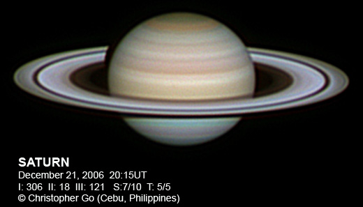 December 12, 2006 After an exciting 2 weeks where we had a brush with Super Typhoon Durian and a near miss with Typhoon Utor, clear skies are back. I was also sick after taking my last image probably due to flu and fatigue! Condition was great this morning. The sky was very steady. Note the northern hemisphere of Saturn gets more and more visible now. The NNTZ is very prominent! There are even details on the NNTB!! The Southern hemisphere belts are getting clearer as we get near opposition and as Saturn gets bigger and bigger. Note the white spot on the SEB to the right of the CM. This is my best image of Saturn!