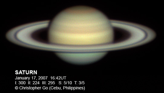 All images were taken using a Celestron C11 SCT and a DMK 21BF04 camera. All images are processed using Registax 4. All these images were taken in my home at Banilad, Cebu City, Philippines! You can also see my past images of Saturn at the ALPO Japan Kansai Branch site. |