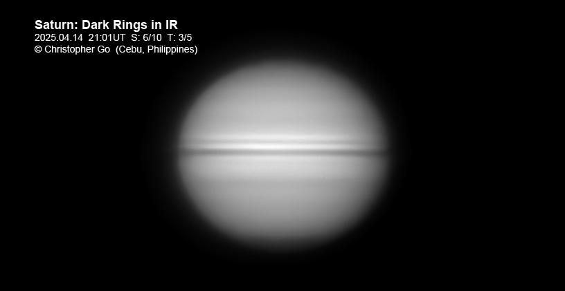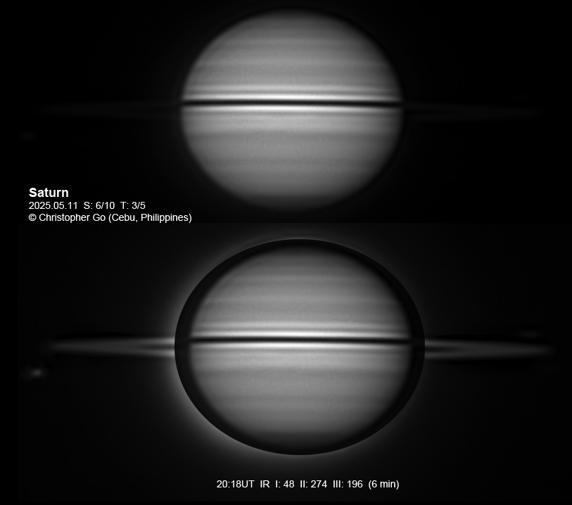 May 11, 2025 I had a very short imaging run today because of clouds. Here is an IR image of Saturn. Normally the rings are invisible now. But when histogram is stretched on the the ring area, the rings become visible. Dione can be see on the left just below the ring.