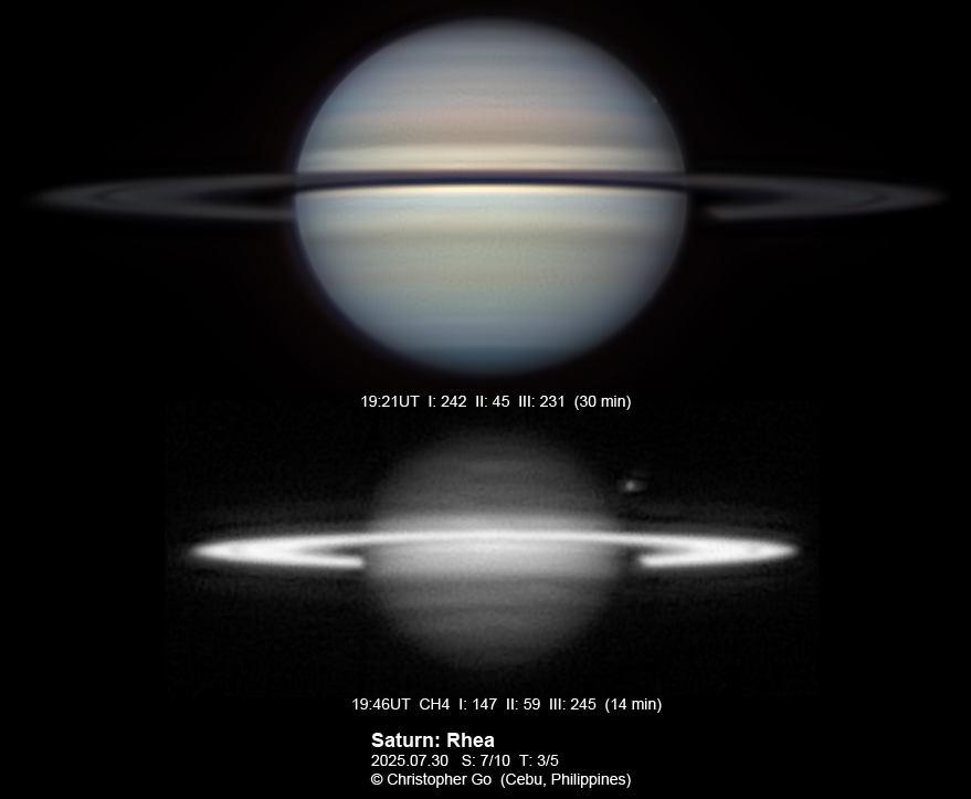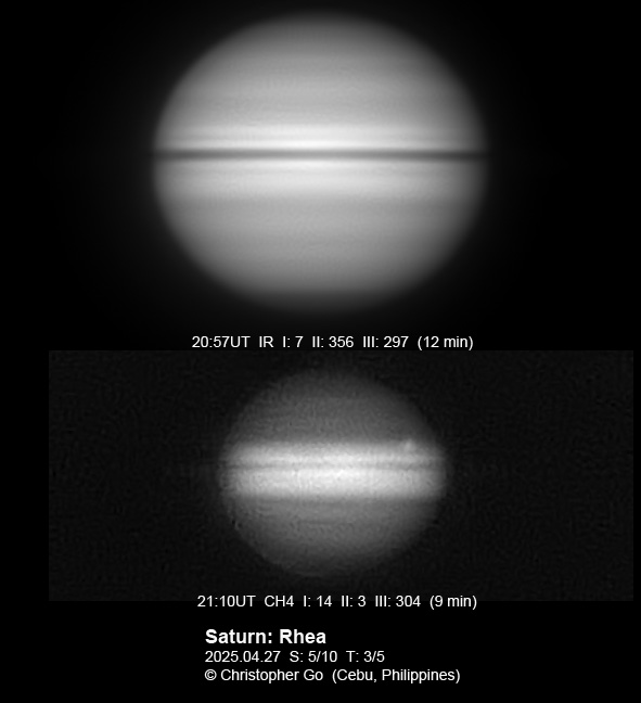 April 26, 2025 I did not expect to image today because it rained hard all night last night. But somehow there was a clearing on the eastern horizon. Seeing was still very unstable with Saturn at 24deg. Saturn is still "ringless". Even in methane band, no ring can be seen despite the ring being many times brighter in methane band that the surface of Saturn. Rhea is prominent on the methane band image as a bright spot. The south polar cap is very dark.
