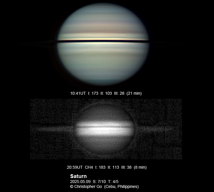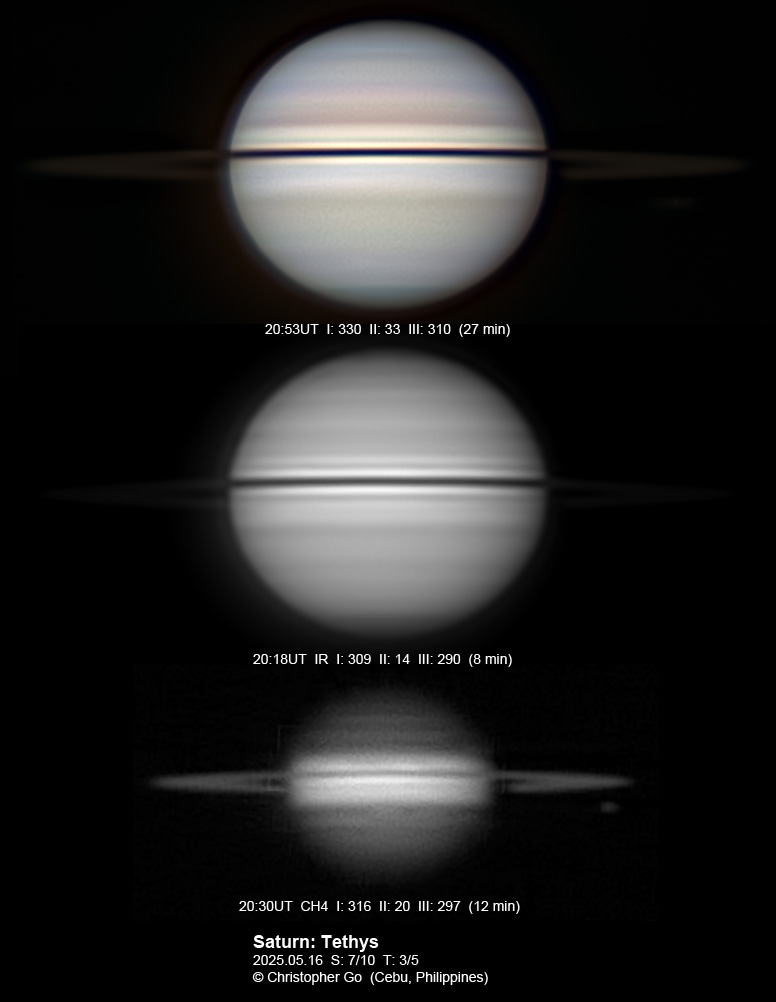 May 16, 2025 Conditions were better today as Saturn gets higher. But it is still below 40deg from my location. The rings are slowly showing especially in methane band. Saturn looks normal with no storms or spots visible. The south pole is still very dark compared to the the north pole. Tethys can be seen below the ring in the methane band image.