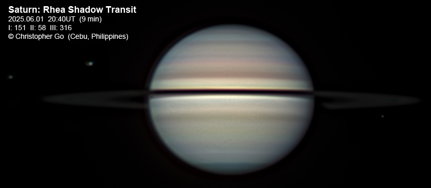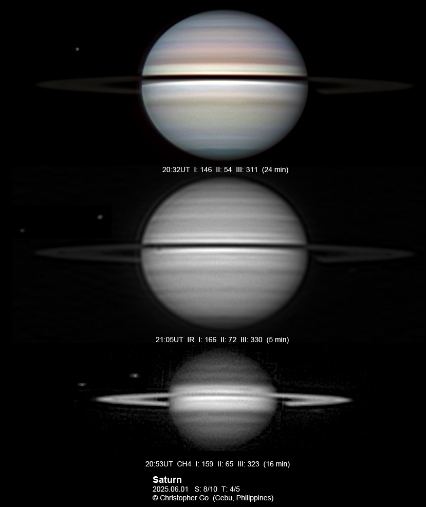 June 1, 2025 After days of horrible weather I finally had a clearing. Seeing was very good today as Saturn is now higher in the sky. The rings of Saturn are still dark because we are seeing the underside of the rings. But the rings are getting brighter in methane band. The shadow of Rhea can be seen below the ring on the IR image. Three of Saturn's moons are visible. The brightest is Rhea, Tethys on the far left and Enceladus on the right below the rings.
