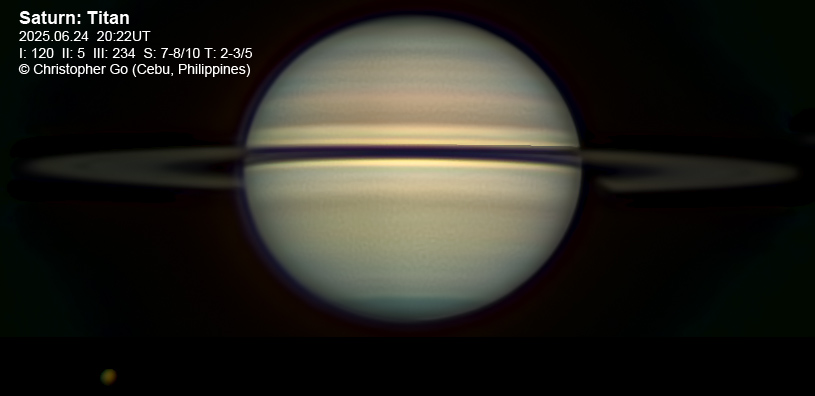 June 24, 2025 After weeks of horrible weather, I finally had some clearing. Seeing was good but transparency was horrible as I had to image through thin clouds. Saturn's rings are still dark. The Cassini Division can now be seen. There are no prominent storms visible on Saturn on this region. Titan can be seen on the lower left.