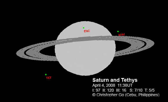 April 4, 2008 Seeing was unstable this evening. Tethys is visible in Saturn's left. Enceladus is visible in mid-transit at the NEBn at the CM. Click the image on the right for an animation made by Mark Crossley to view where Enceladus is. Thanks Mark! Please click this link to download the raw luminance image.