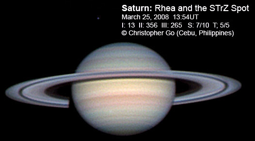 March 25, 2008 Seeing was not very good this evening. I had to image between the clouds! The STrZ spot can be seen to the left of the CM. Contrast is very low with this spot. Rhea is above Saturn.