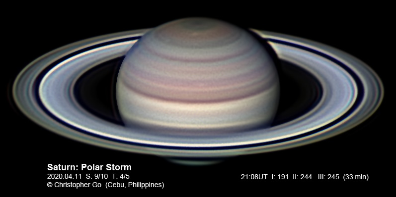 April 11, 2020 Seeing was perfect today. I was again limited by sunrise. The North Polar Storm can be seen on this image. There is also another white spot on the CM at the NEBn. There is also another spot just below the polar storm rising on the left. The Polar Hexagon and the Polar Spot can also be seen.