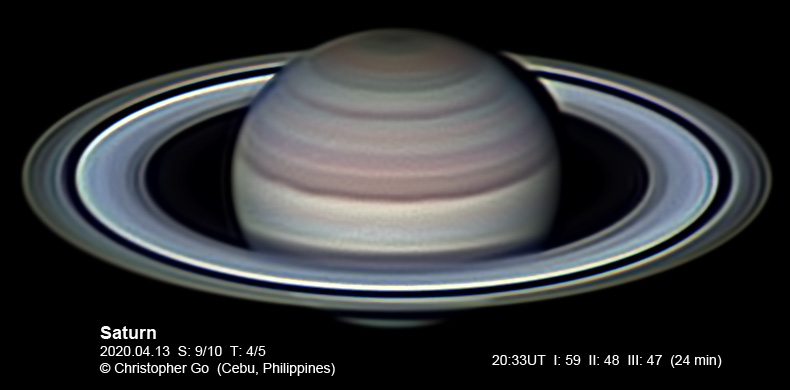 April 28, 2020 I overslept today so I was only able to capture a few image of Saturn before sunrise. Seeing was average this morning. There is a hint of a white spot at the CM of the NEBn.