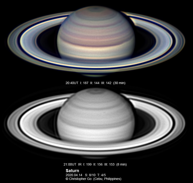 April 14, 2020 I started imaging early today. Seeing was good and I was finally able to capture some IR image of Saturn. Saturn in quiet in this region except for some small white spots on the NEB at the CM. The Polar Hexagon and the polar storm is distinct in IR. Note the small dark spot on the NTrZ in the IR image.