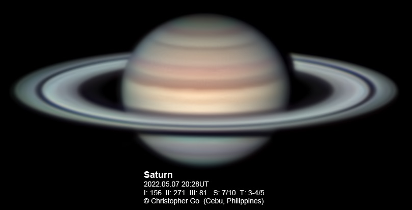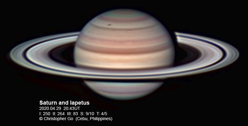 April 29, 2022 Condition had been terrible during the last few days. The sky finally cleared today! Seeing was perfect! I had a big surprise when I applied wavelets to the images, a dark spot showed up! I didn't know that a satellite of Saturn would happen now even though the rings aren't edge on yet. After consulting Winjupos and with Almir Germano's suggestion, it is a very rare transit of Iapetus! The excitement really woke me up as my brain wasn't fully functioning this early! With the HDR image below, a lot of low contrast details can be seen.