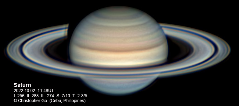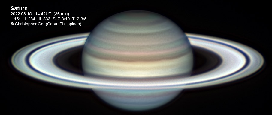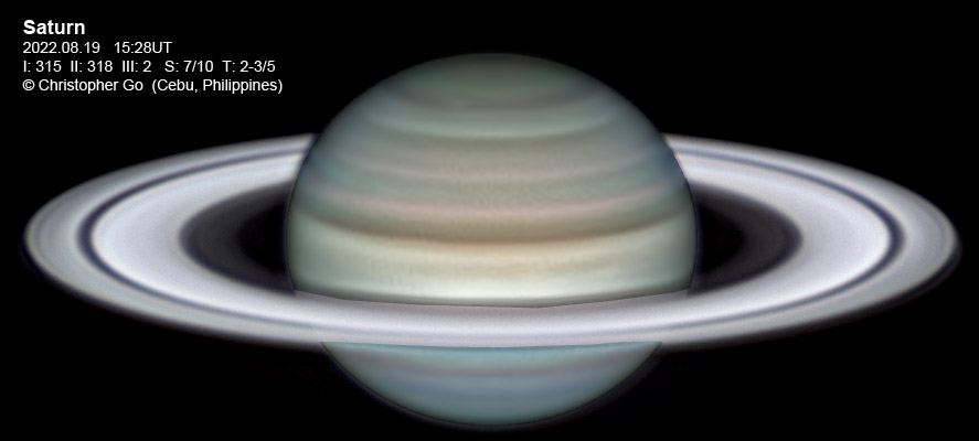 Aug 19, 2022 Condition was a bit frustrating today due to poor transparency. I had to image through clouds and I was imaging at crazy high gains. Seeing was okay. The rings are still very bright due to the Seeliger effect. The belts and bands are well resolved.