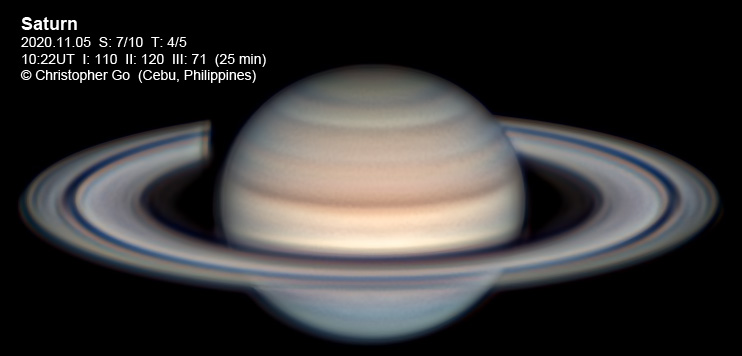 December 23, 2022 I never expected to image today. It was mostly cloudy all day. But miraculously, it was clear in the SW where Saturn was. All around we had threatening thunderstorms! Seeing was very unstable because I had to image just after sunset and Saturn was very low in the sky! I had to use the QHY5III200M. This very low noise camera really help get the details out.